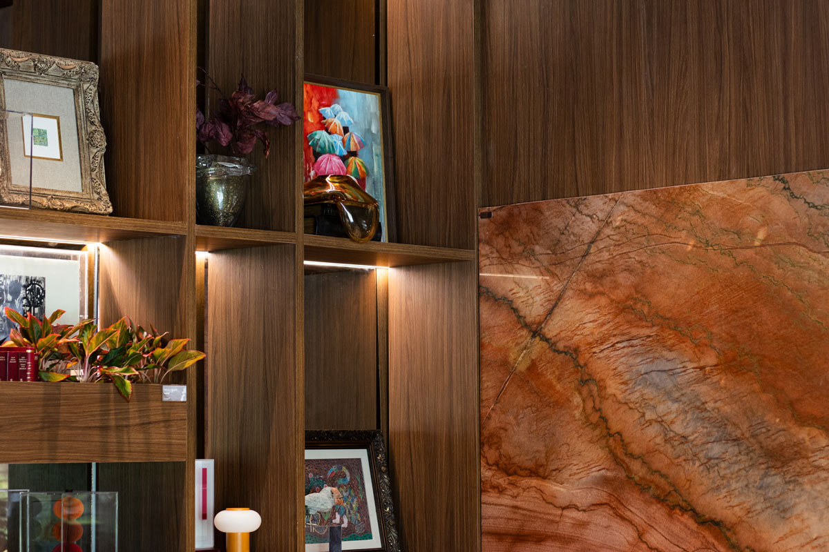 O ambiente é perfeito para receber amigos e degustar um bom vinho em um momento de relaxamento e descontração. Para reforçar essa estética de sofisticação e elegância, o padrão de MDF escolhido foi o Imbuia Caiapó, também no acabamento BP Poro SuperMatt, um amadeirado de tonalidade intensa e escura, inspirado na árvore nativa imbuia e nos povos originários.