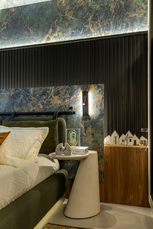 Para transmitir esse conceito que acolhe e traz a sensação de bem-estar, o padrão escolhido foi o MDF Amêndoa Natural, da Linha BP Poro SuperMatt, um amadeirado de nuance amendoada que proporciona uma transformação impactante, combinado ao Ripado em Barras no padrão preto.