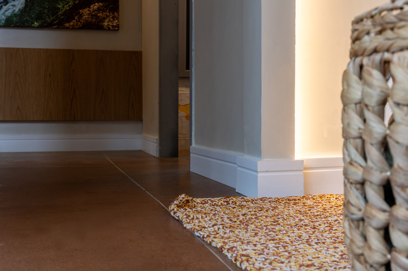 Para compor a estética desse ambiente inovador e criativo, ela utilizou o Rodapé Acqua New Branco Max 100 mm, que deixa o acabamento ainda mais harmônico.