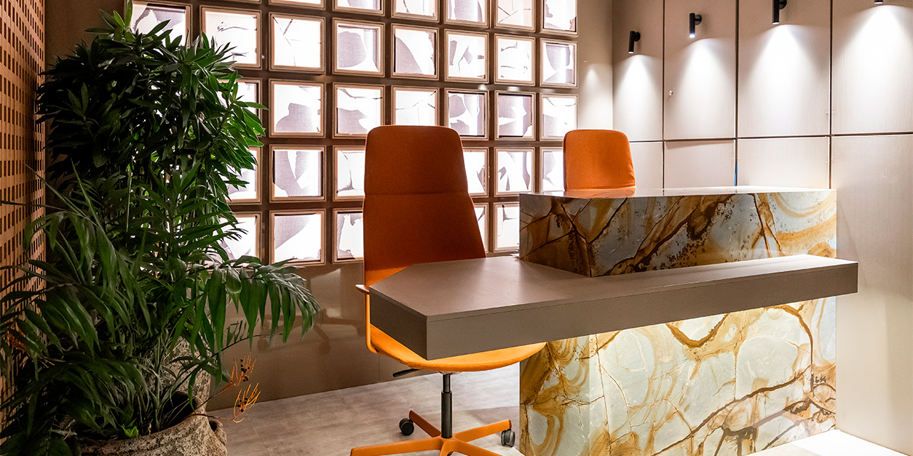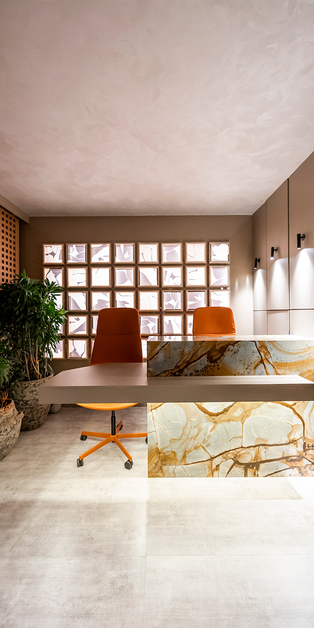 Ele utilizou diversos elementos nessa cor, combinando objetos em linho e fibra com dois padrões de acabamento BP Poro Supermatt: o Madero Cacau, inspirado no fruto do cacau, com uma tonalidade marrom delicada e discreta, e o Amêndoa Natural, um amadeirado mais aquecido.