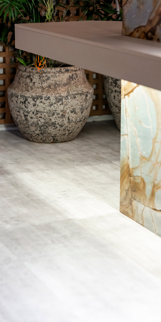 Com uma moderna estrutura de vidro, que permitia apreciar a vista da natureza e proporcionava o contato com a luz natural, eles escolheram produtos que valorizam a estética natural. Um exemplo é o piso vinílico LVT Working Nebraska, com seu padrão acinzentado que remete a pedras naturais.