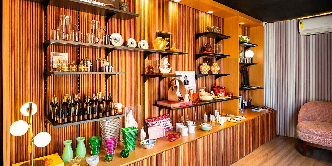 Na Loja Petit Palais, a designer de interiores Adriana Fontana misturou diferentes tonalidades, utilizando luzes amarelas para criar um ambiente harmônico e acolhedor.