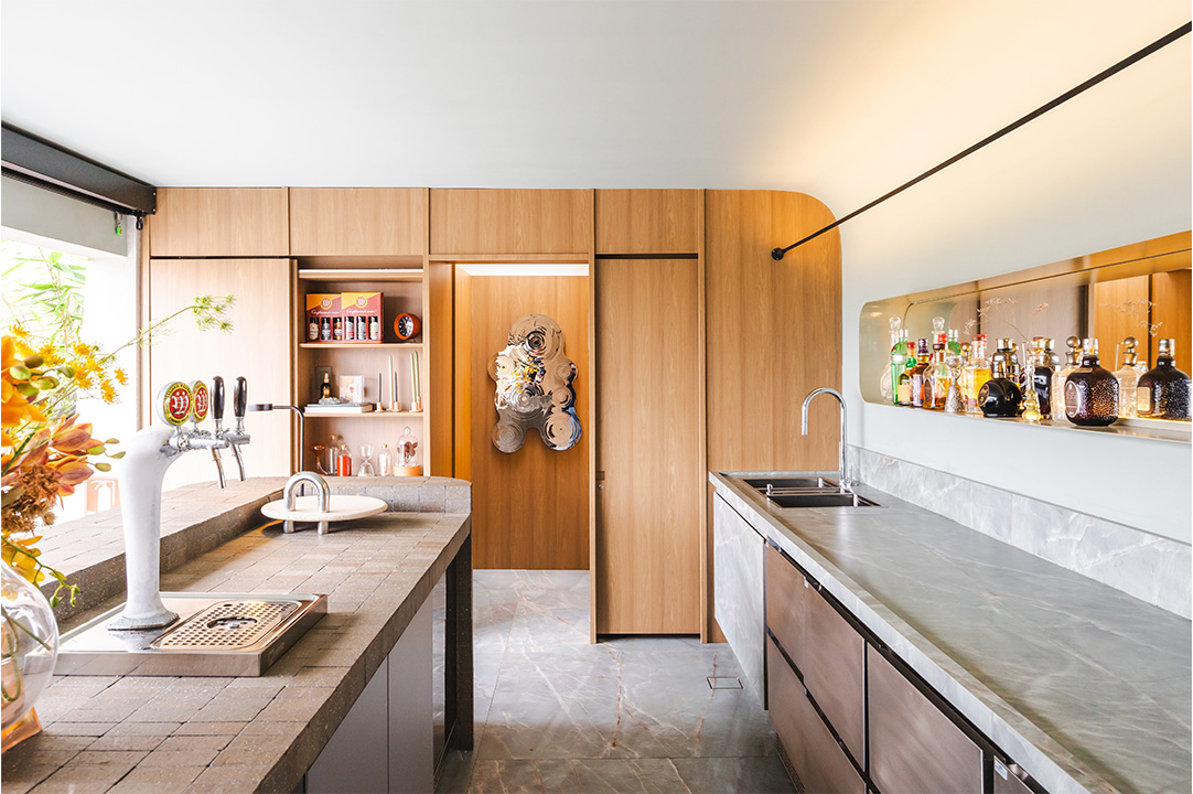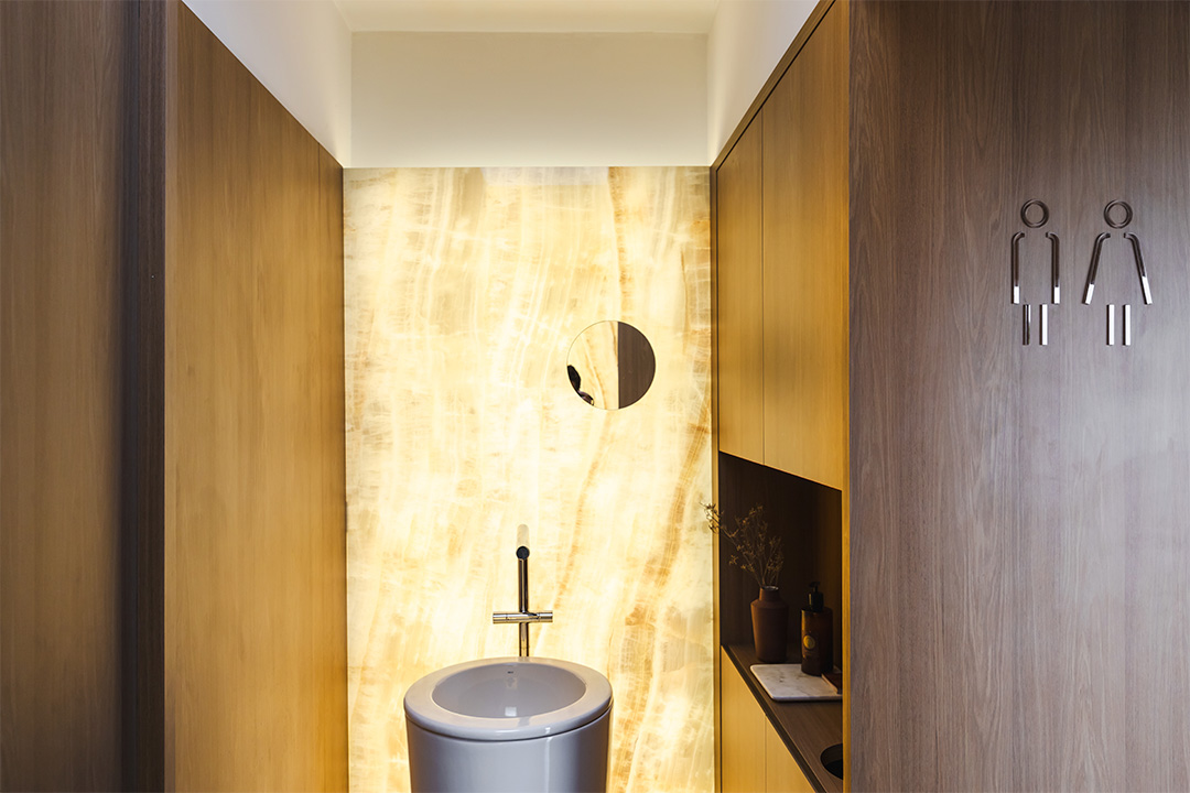 Nesse arrojado e refinado projeto, os protagonistas foram os padrões de tons escuros! O espaço tem um teto curvilíneo que remete às tradicionais caves de vinho, oferecendo uma sensação imersiva com iluminação difusa para acolher todos no ambiente.