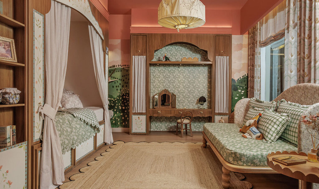 A designer se inspirou em suas próprias experiências para criar esse dormitório que transformou uma biblioteca repleta de história e imaginação em um quarto criativo e aconchegante, pensando na trajetória de uma avó que se prepara animada para receber de braços abertos sua amada neta.