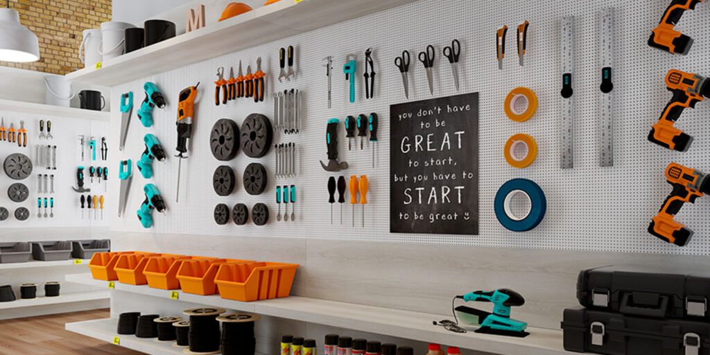 Na imagem acima, temos o padrão Branco Glacial aplicado em uma garagem, servindo como um painel para pendurar ferramentas e outros itens, deixando-os mais organizados e mais fáceis de serem encontrados. A tonalidade branca e suave do padrão contribui ainda mais para essa finalidade.