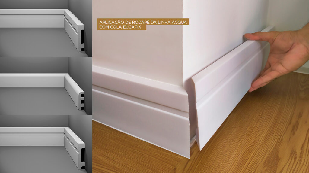 Os rodapés são acessórios importantes para dar acabamento à instalação dos pisos laminados nos ambientes, camuflando a junta entre o revestimento e a parede, conferindo um visual mais sofisticado. Com linhas que atendem a diferentes necessidades, a Eucatex desenvolveu a cola Eucafix, ideal para aplicação dos rodapés Acqua, pois oferece ótima fixação e durabilidade.