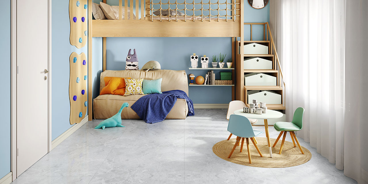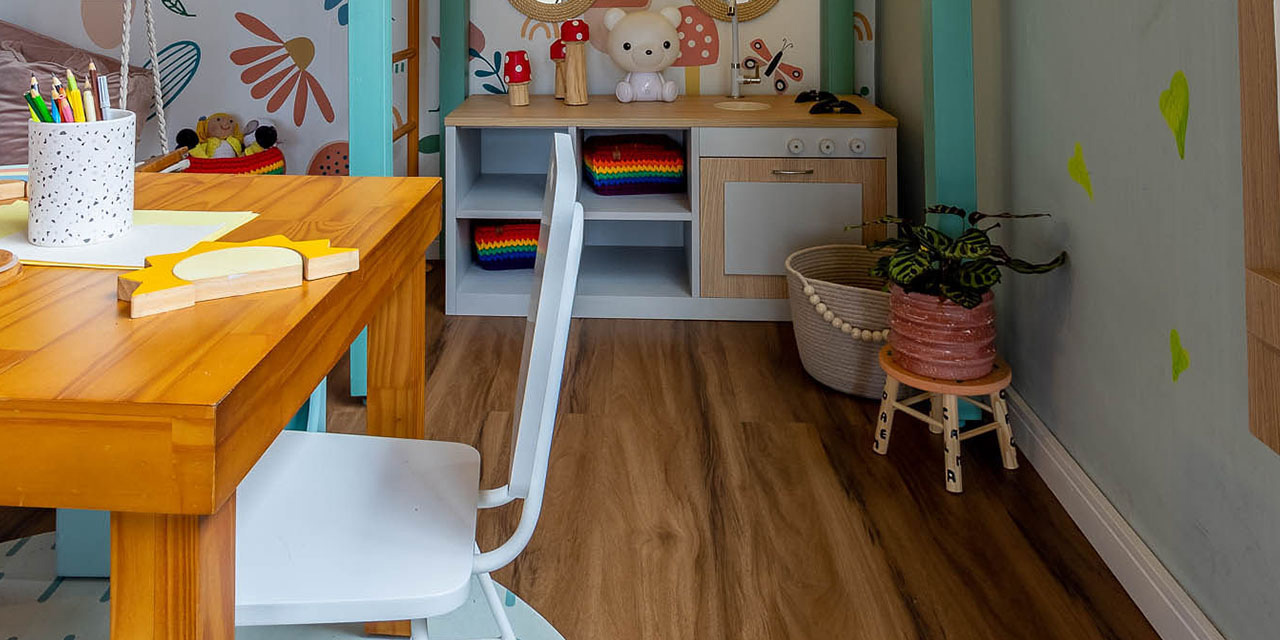 Ainda falando de espaços para a criançada, temos aqui uma inspiração de brinquedoteca, com muitas cores vivas que despertam o brincar e a imaginação. Para combinar com a mesa, o piso escolhido foi o amadeirado quente Tucson.