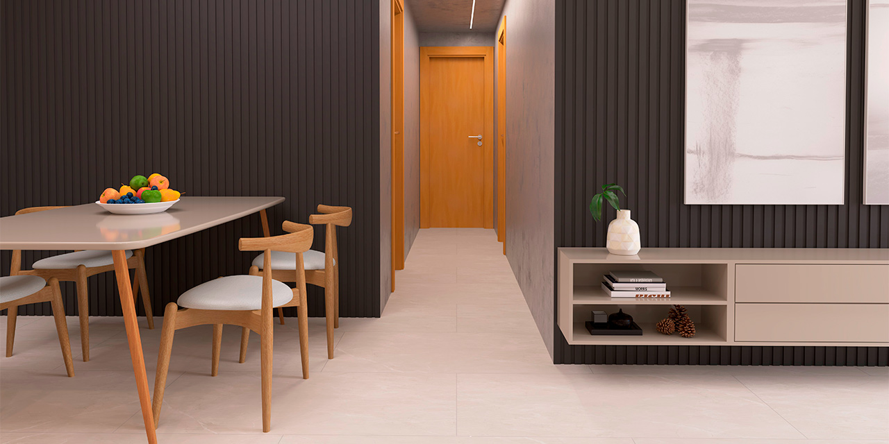 Na foto acima, vemos o padrão Branco Max aplicado em um armário embutido na parede, que vai do teto ao chão, tornando-se um belíssimo item de decoração. A aplicação do padrão nos armários de uma sala de jantar tornou o móvel mais discreto, devido à ausência de puxadores, e o cômodo, mais espaçoso.