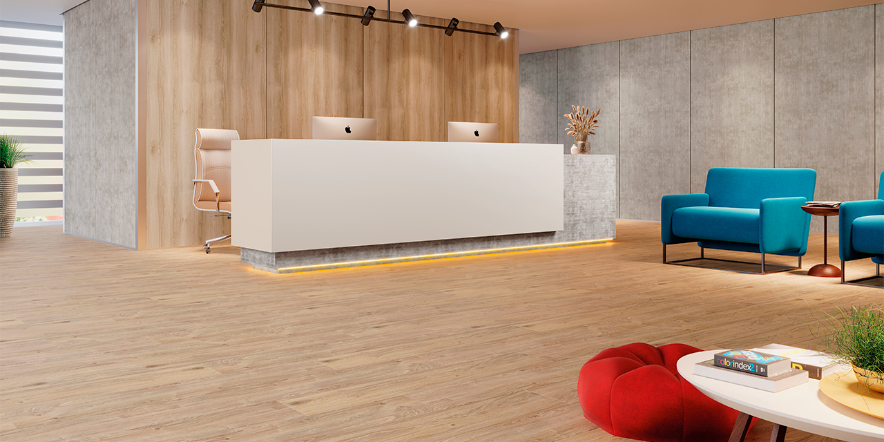 É possível ver na prática algumas combinações de espaços utilizando Eucafloor e Divisórias Eucatex a partir da imagem acima, em que temos o padrão Smoki, da Linha Novitá Pró, que traz uma tonalidade cinza que remete ao cimento queimado, compondo com o Carvalho Chamonix, da Linha Max Elegance, de piso laminado.