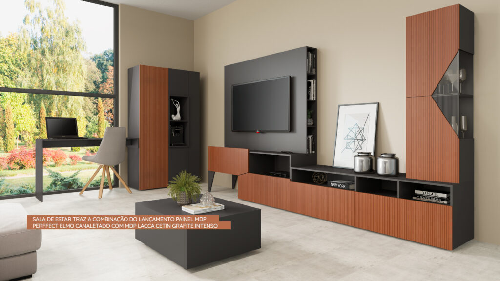 O Elmo Canaletado é inspirado nos painéis ripados, trazendo a referência do mobiliário de alto padrão para o mercado de móveis para a classe C, por meio de um design acessível, que reproduz o efeito visual 3D das ripas e proporciona mais facilidade de manutenção.