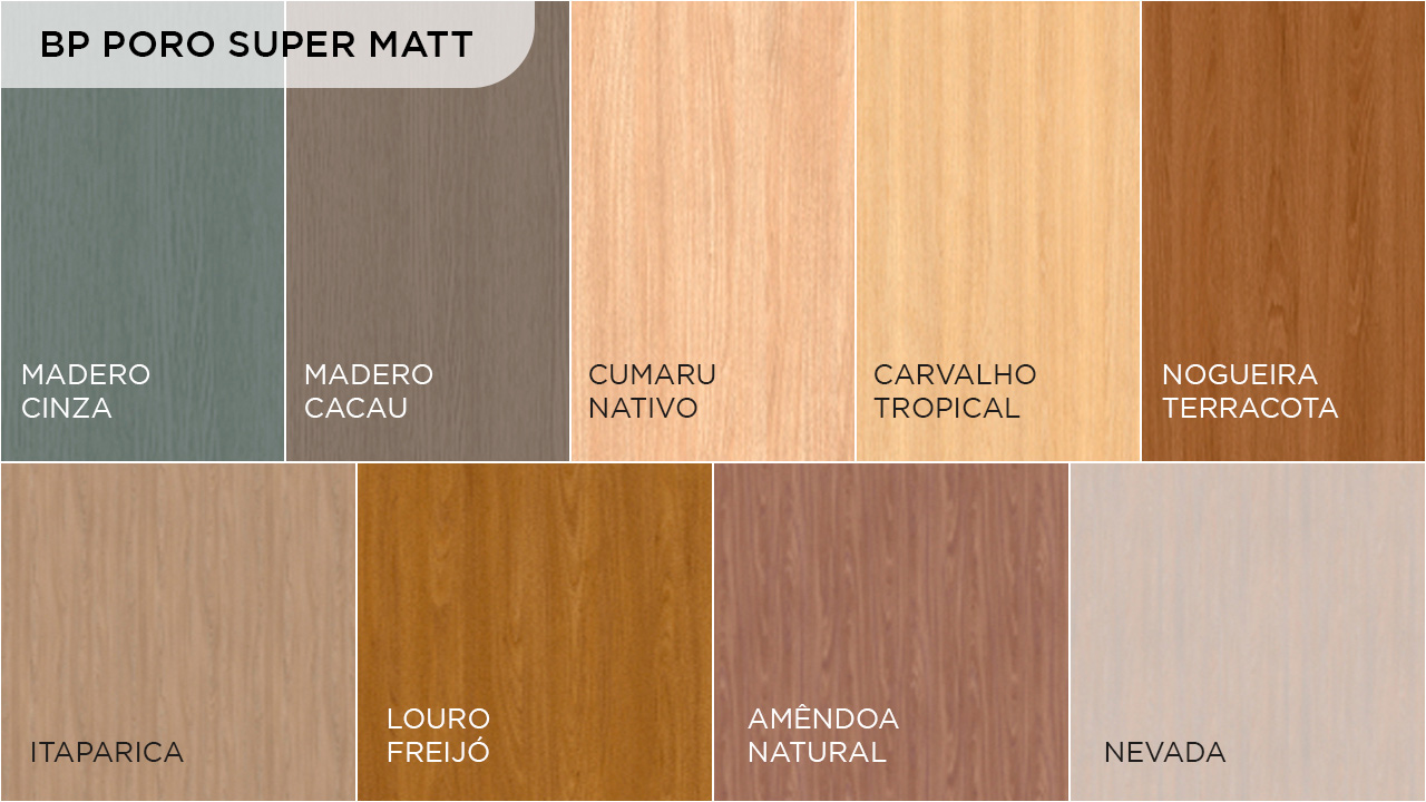 A nova coleção está distribuída em três linhas que trazem diferentes padrões e cores, todos lançamentos para 2024. Na linha destaque, BP Poro Supermatt, temos Madero Cinza, Madero Cacau, Nevada, Carvalho Tropical, Cumaru Nativo, Itaparica, Louro Freijó, Amêndoa Natural e Nogueira Terracota. Na BP Matt Soft, o padrão Pétala Rosa. E na linha Lacca AD, as cores Verde Mar, Cinza Supremo, Cinza Urbano e Cacau Natural.