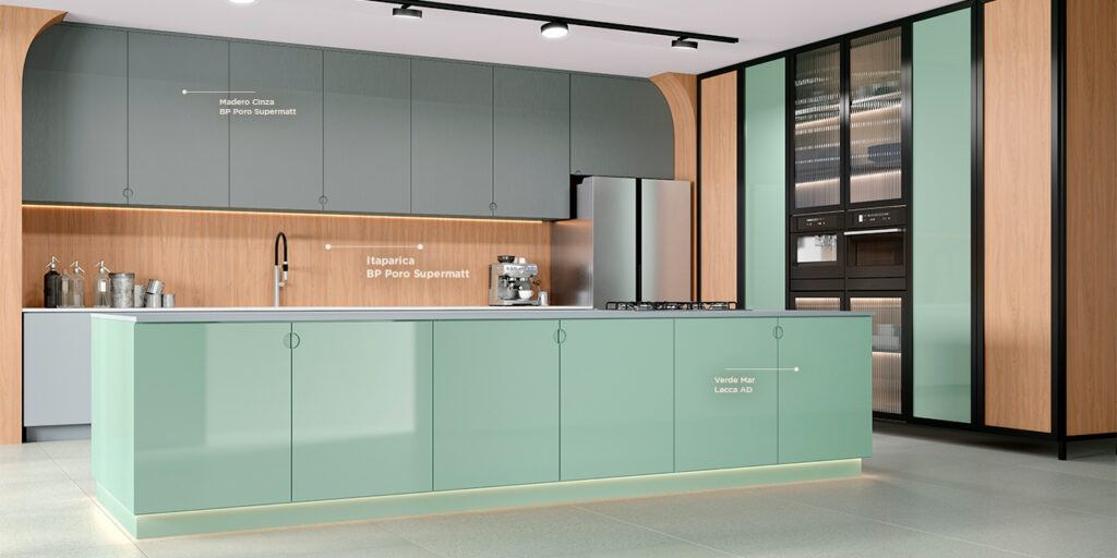 O padrão tem veios discretos e assimétricos, com tons levemente dourados, que ficam em evidência devido ao acabamento Poro Supermatt, que é inédito nas Américas e visa trazer às superfícies uma experiência sensorial que valoriza a textura real das madeiras.