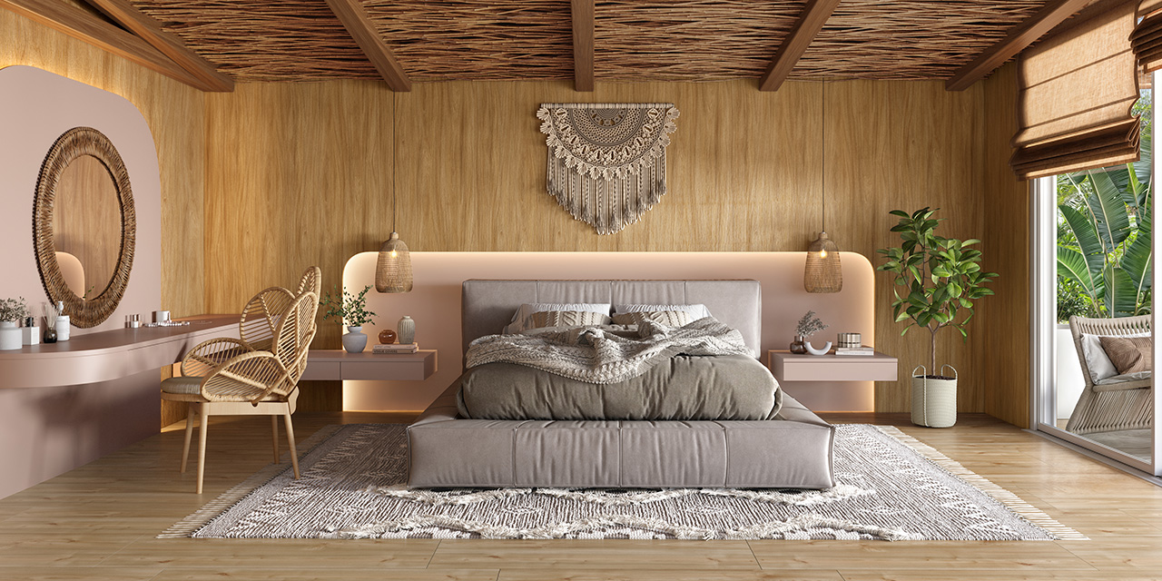 Nesse outro ambiente, um dormitório aconchegante, temos o padrão Tauari Amazônia como protagonista. Desta vez, ele está presente nas paredes de todo o espaço, combinado ao elegante e confortável piso laminado Eucafloor Belmonte, da Linha Gran Elegance. Para um toque de cor, o escolhido para a cabeceira da cama e para a penteadeira do lado direito do ambiente foi o Pétala Rosa, que traz toda a suavidade e delicadeza das pétalas de rosa, com um tom rosado e discreto.