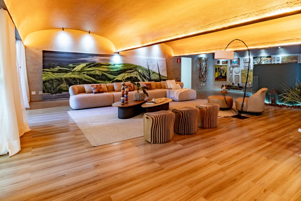O piso laminado da Linha Gran Elegance, com a régua mais larga do mercado, foi escolhido para trazer elegância à Sala de Experiências, da arquiteta Sofia Ephram. O ambiente propõe uma reconexão profunda com o nosso interior, conectando-nos com a natureza e com o nosso lar, oferecendo a oportunidade de deixarmos as telas de lado e aproveitarmos o momento para descansar.