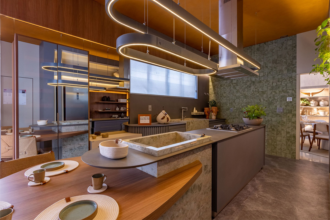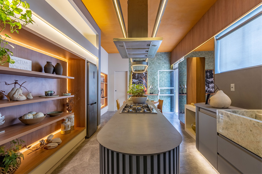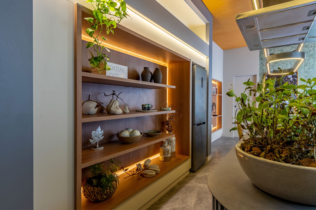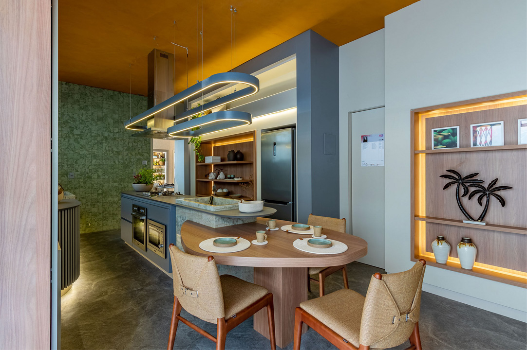 Nesse fascinante espaço, que reflete a autenticidade do design brasileiro e a conexão com a natureza, marcando uma fusão memorável entre cultura e estilo, foi utilizado o padrão MDF Eucatex Verde Amalfi, que compõe a linha BP Grafis.
