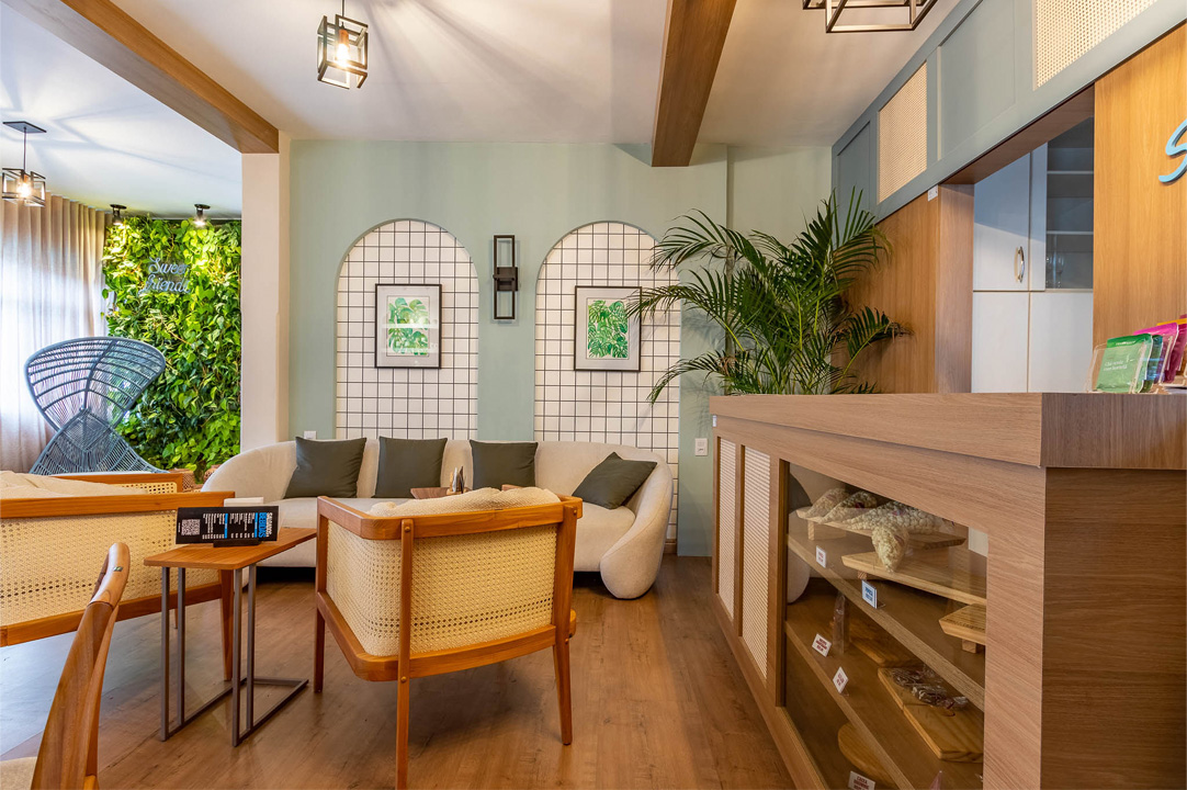 Esse aconchegante espaço, que foi inspirado no estilo mediterrâneo e busca proporcionar sensação de relaxamento e aconchego, traz o azul dos arcos que lembram o oceano e também outros elementos da natureza presentes no projeto, como plantas, aquarelas e texturas naturais.