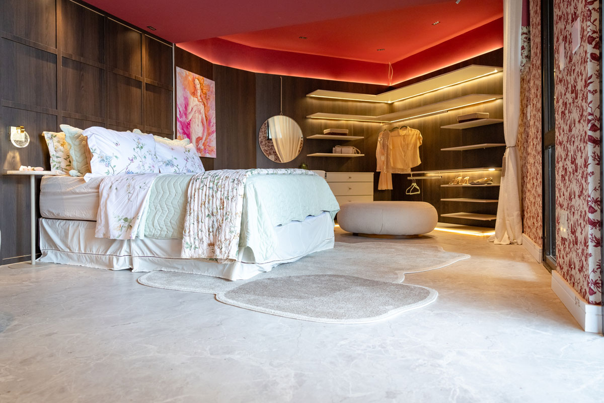 No Quarto Vermelha Essência, o arquiteto Ariel Macatrão apresenta um espaço que transmite elegância e feminilidade. Com uma estética decorativa com tonalidades avermelhadas e cheias de vida, o ambiente realça texturas e estampas que valorizam o espaço, trazendo conforto e harmonia.