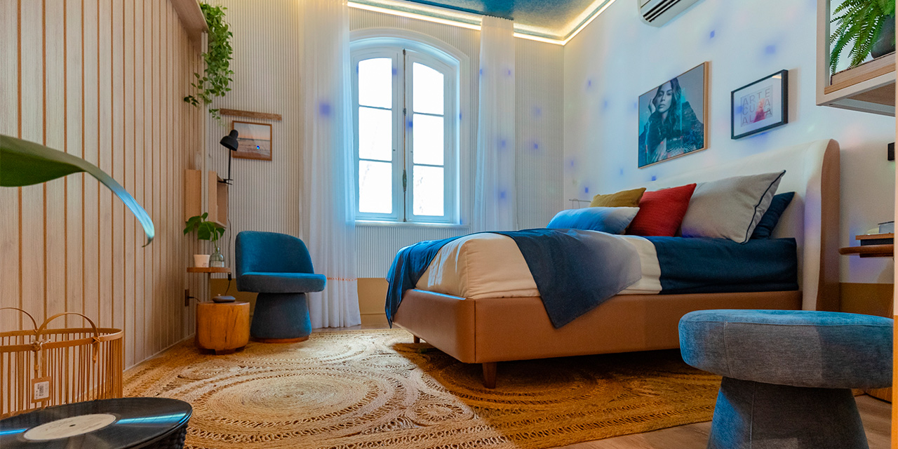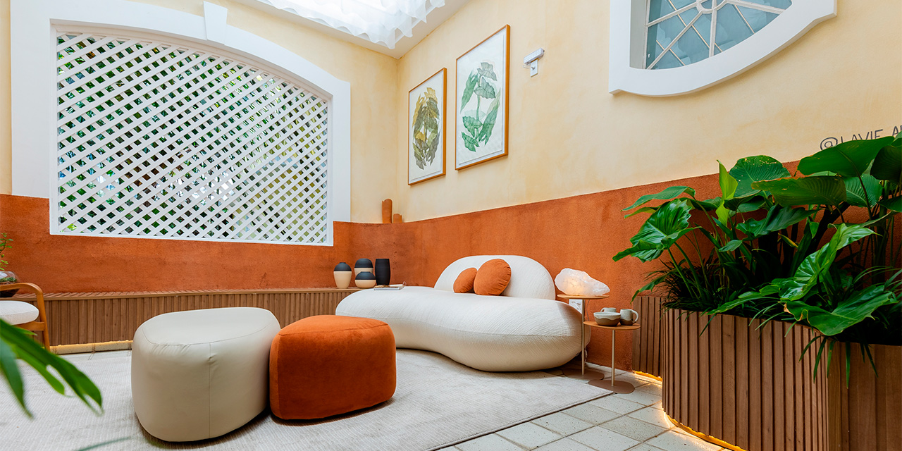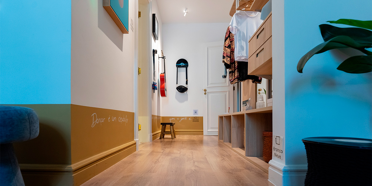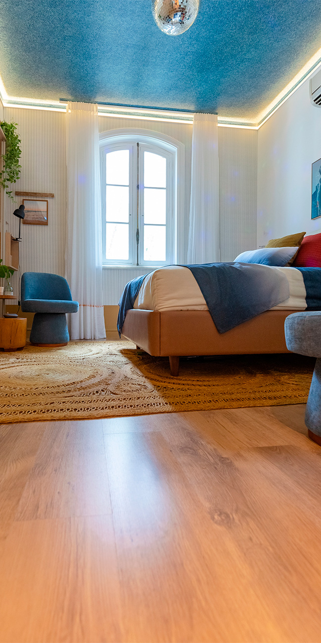 Nesse espaço vibrante e criativo que traz a era disco dos anos 70 com um toque de romantismo, design sustentável e brasilidade, o piso escolhido foi o padrão Cacau, da Linha Prime Click, de piso laminado Eucafloor.