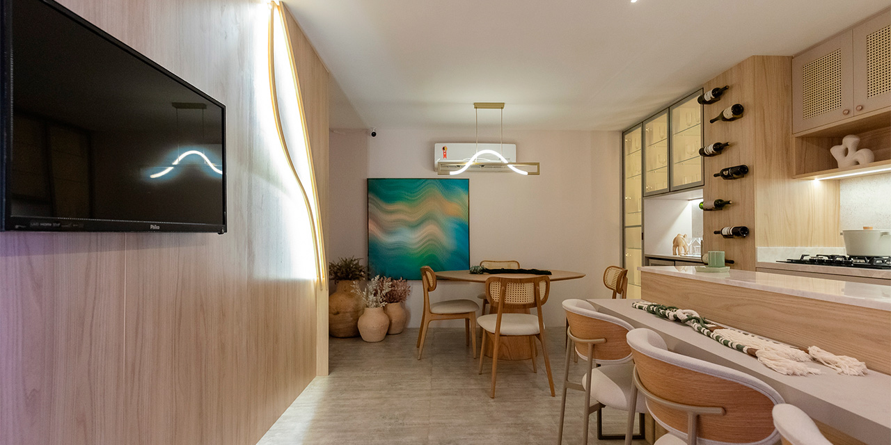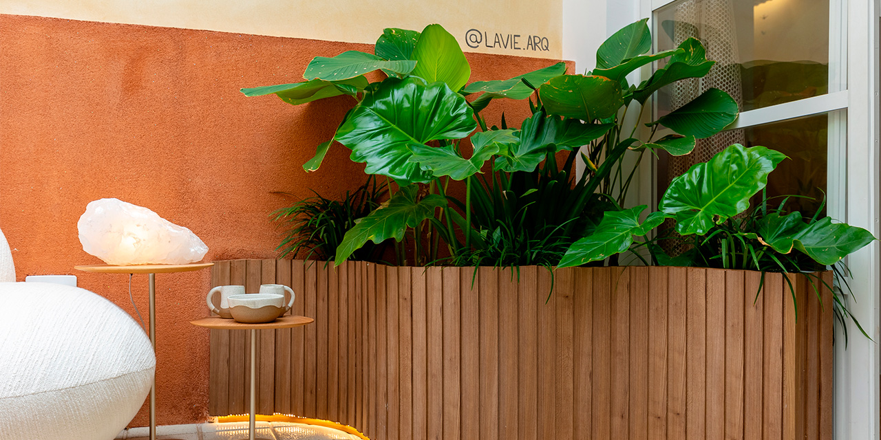 A decoração biofílica, que traz elementos da natureza, é composta pela presença do Ripado Eucatex em Barras Freijó Âmbar, um amadeirado que transmite extremo aconchego e glamour.