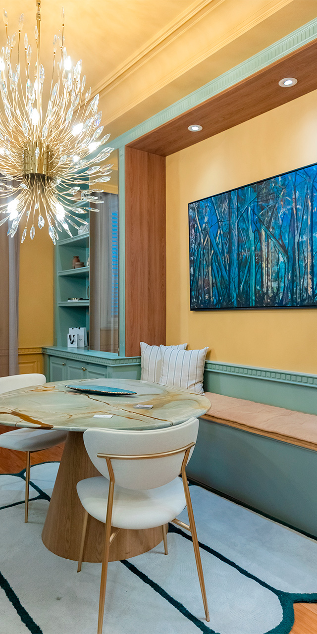 Em um ambiente sofisticado e romântico, ele usou a criatividade da combinação dos painéis MDF BP Eucatex, aliando o padrão Verde Mar, com acabamento Matt Soft, fosco e aveludado, que traz um esverdeado discreto e suave, ao amadeirado Nogueira Terracota, com acabamento Poro Supermatt, presente em alguns detalhes que se destacam pela sua tonalidade dourada e imponente.