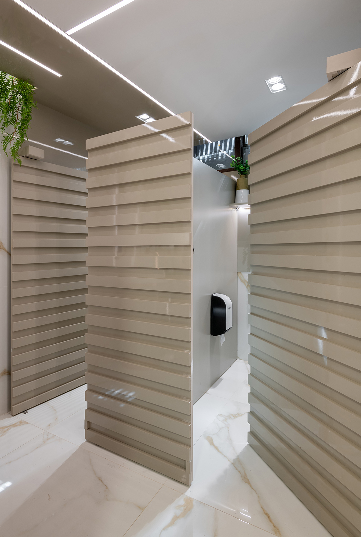 No espaço do Restaurante, do arquiteto Thiago Herrera, ideal para dar uma pausa durante a visita aos ambientes e tomar um café para descansar, foi utilizado o MDF no padrão Cinza Urbano com acabamento Matt Soft, combinando com o Ripado Eucatex no tom Branco.