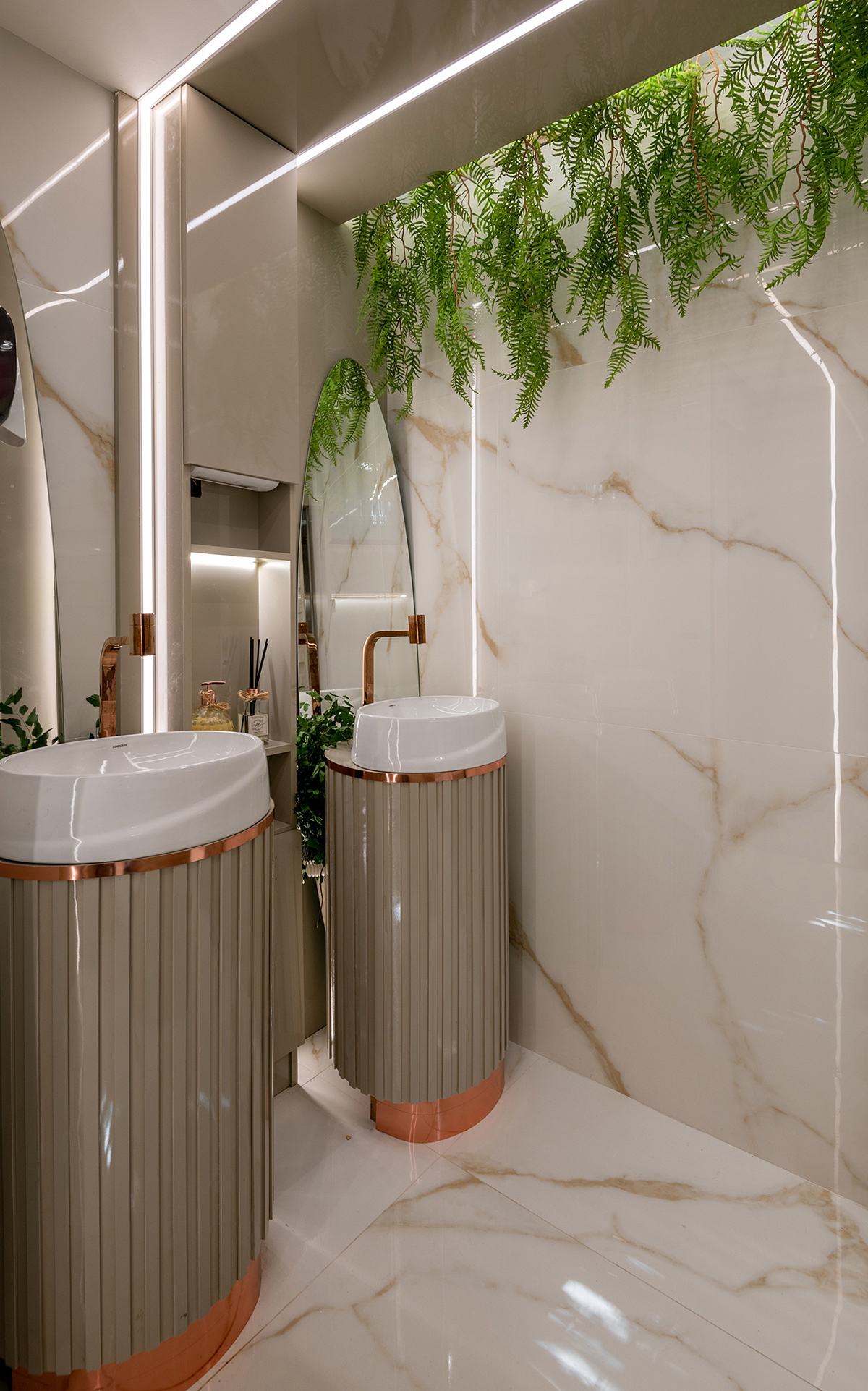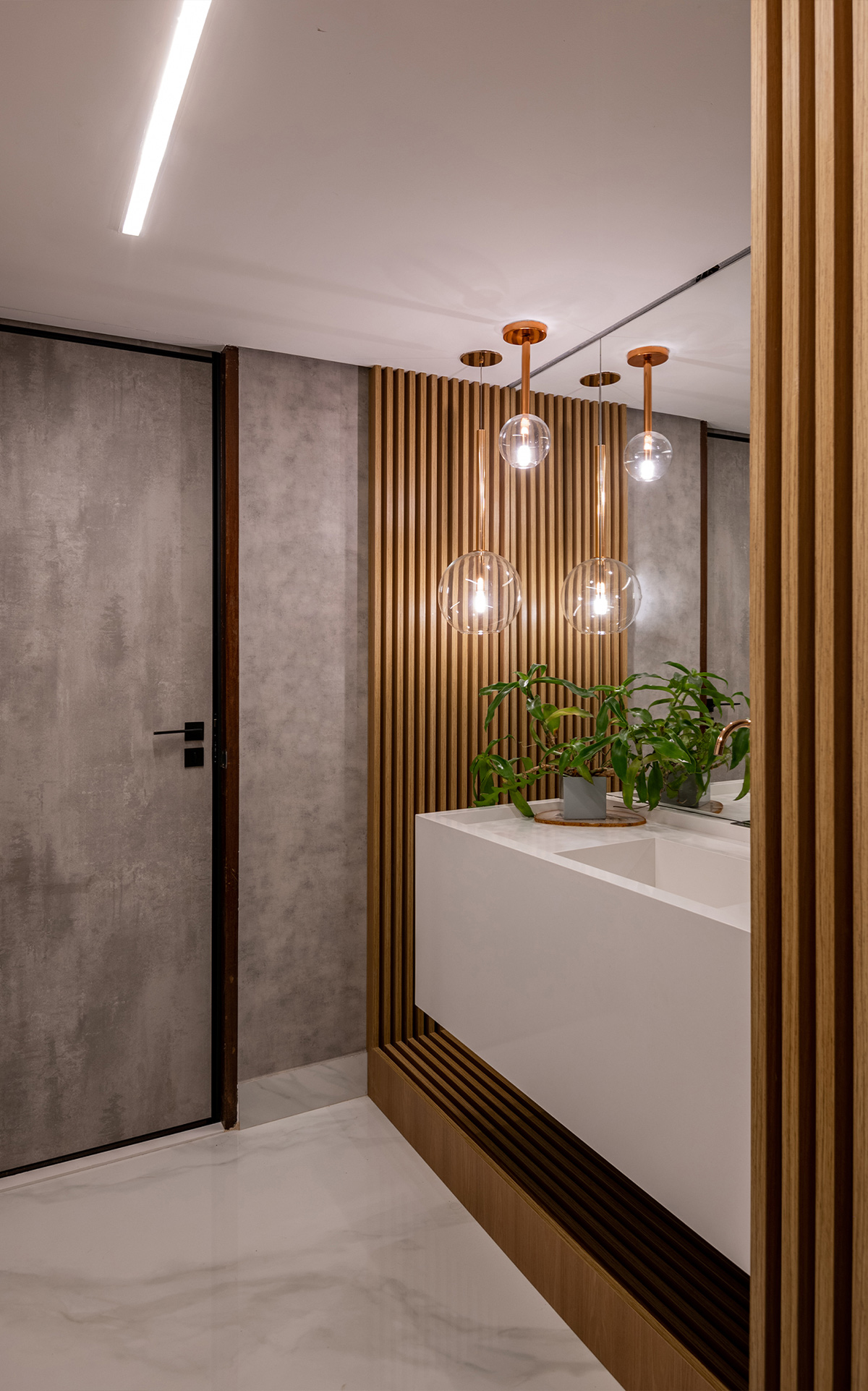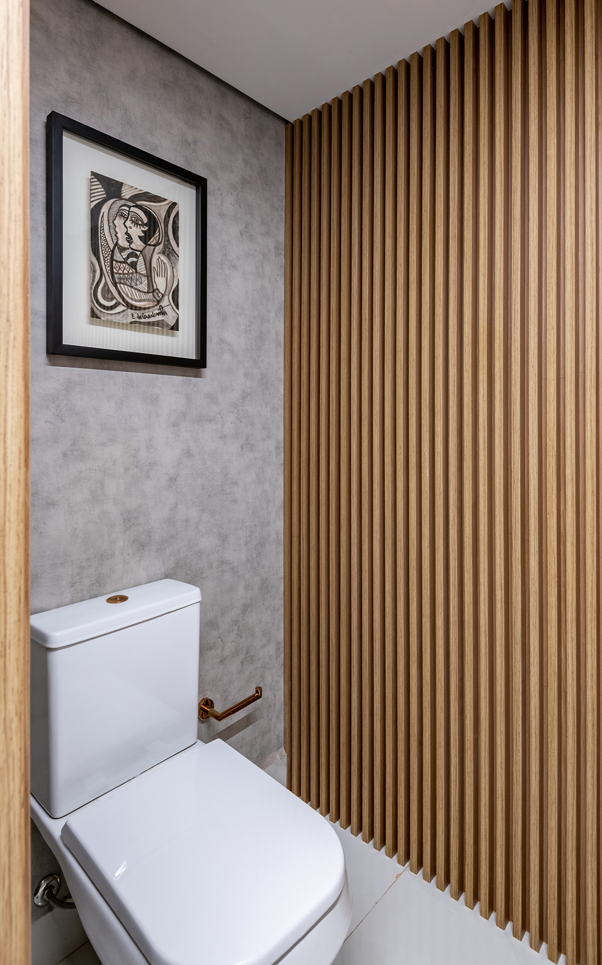 No projeto do Lavabo, de Roberta Abreu, a arquiteta inovou na criatividade e utilizou o padrão MDF Eucatex no padrão Freijó Brasil com acabamento Matt Soft, que com seu exuberante tom dourado, que valoriza os veios e as belezas das madeiras, ficou encantador.