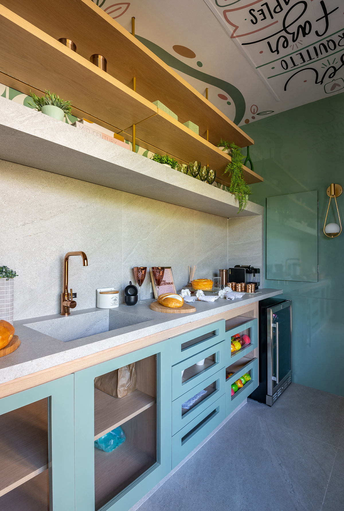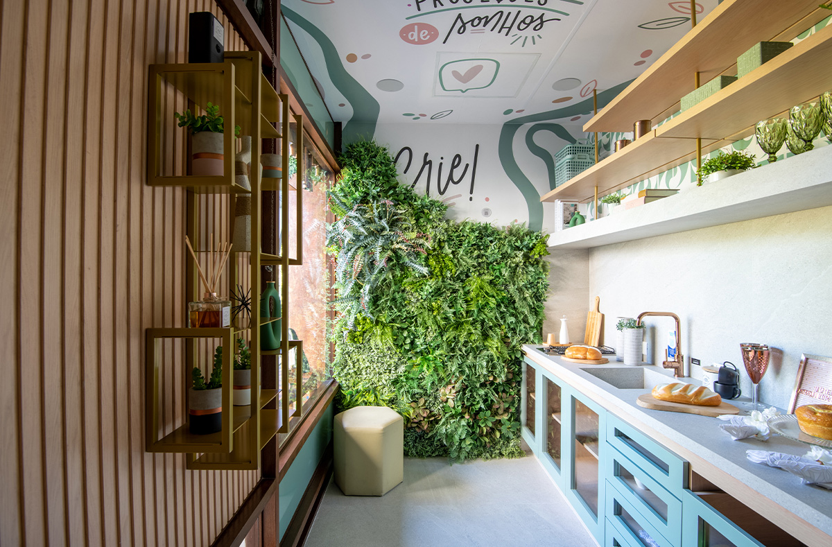 No espaço Copa da Família, da arquiteta Priscilla Tezoto, foi criado um ambiente alegre e confortável! A combinação entre os padrões Verde Bellagio, da Linha Lacca AD, com o Natural Oak, da Linha BP Raízes, ficou incrível. Ela também utilizou o Ripado Eucatex em barras de encaixe na tonalidade Natural Oak para dar um toque na decoração.