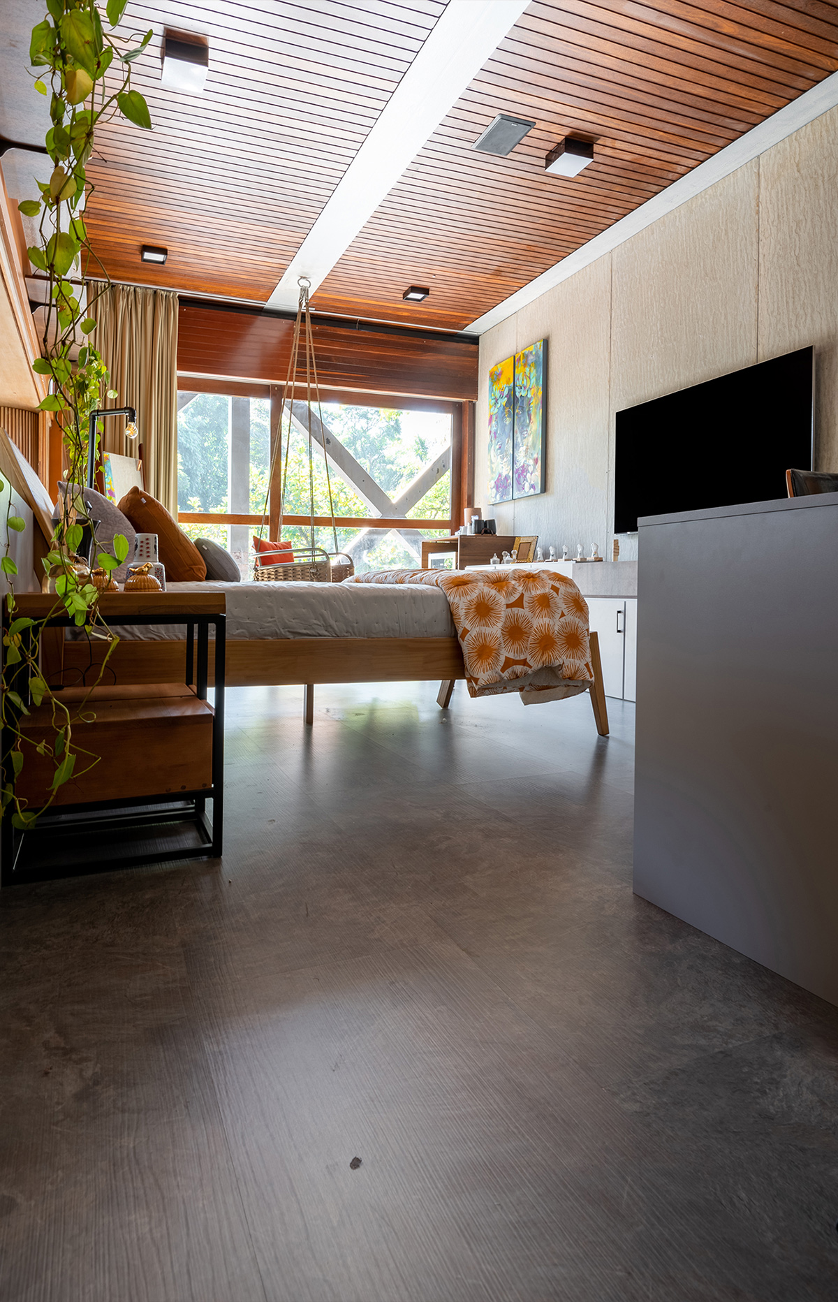 É impossível não se inspirar em um quarto belíssimo como este! No Dormitório da Estilista de Jóias, da arquiteta Vivi Ferreira, foi usado o piso laminado Eucafloor Gran Elegance Stone. O Rodapé Acqua New, na tonalidade preta, foi utilizado para dar acabamento ao ambiente.