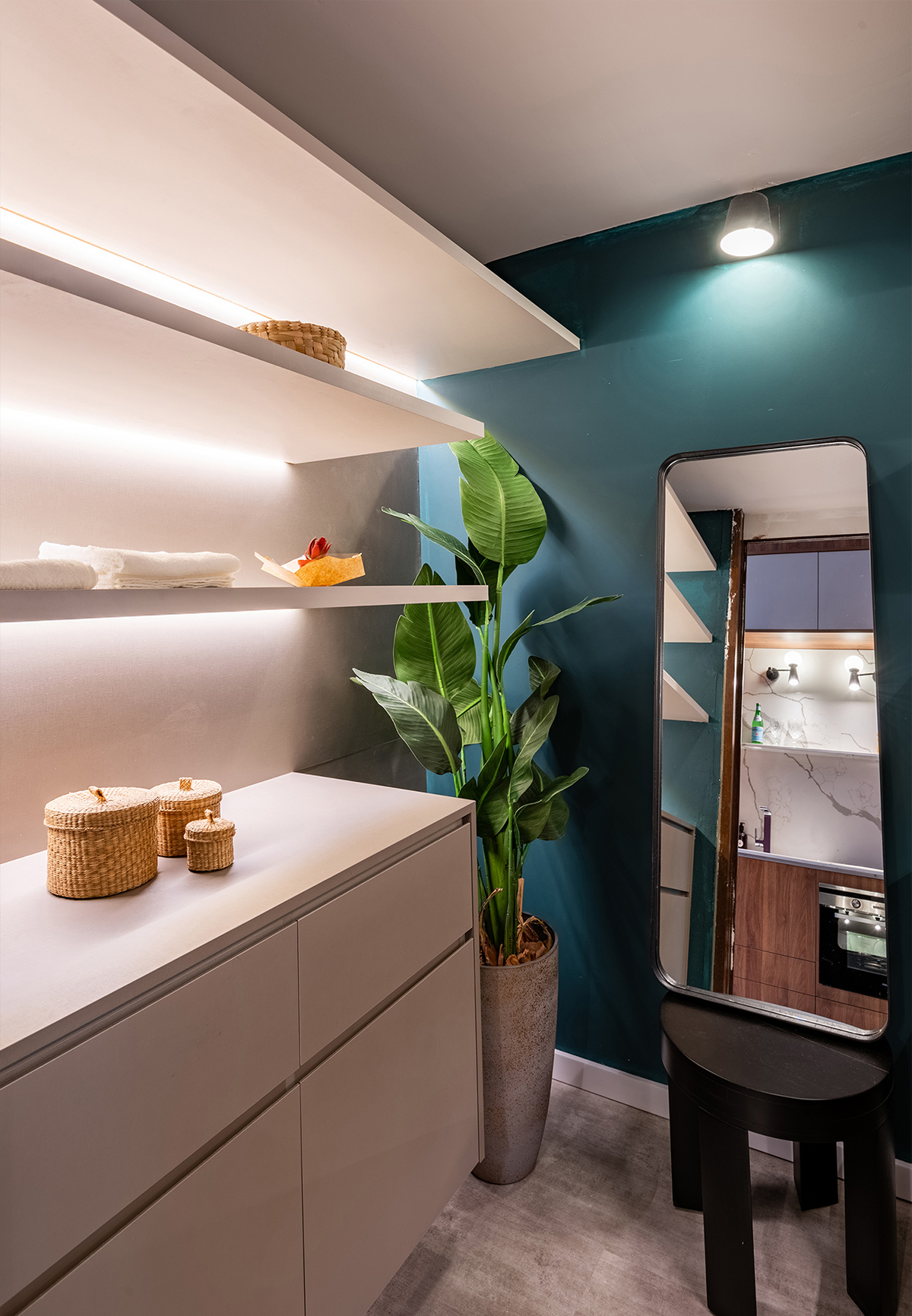 Para o closet, a arquiteta optou por utilizar os padrões Cinnamon e Fumê Clássico, ambos com tonalidades claras e suaves que fazem parte da Linha BP Grafis. Já no banheiro, foi usado o padrão Noce Oro, da Linha BP Raízes, para compor as paredes e o armário, enquanto o piso utilizado foi o Arizona White, da Linha Cementi, de Eucatex Porcelanato.