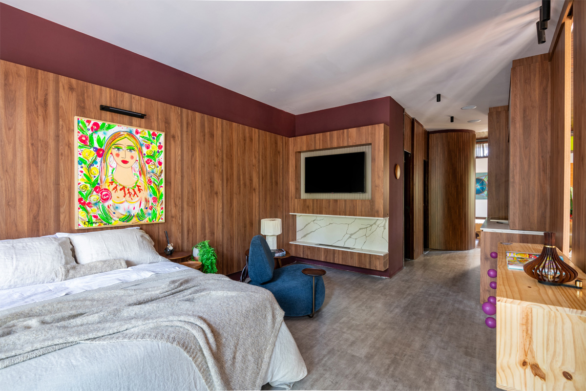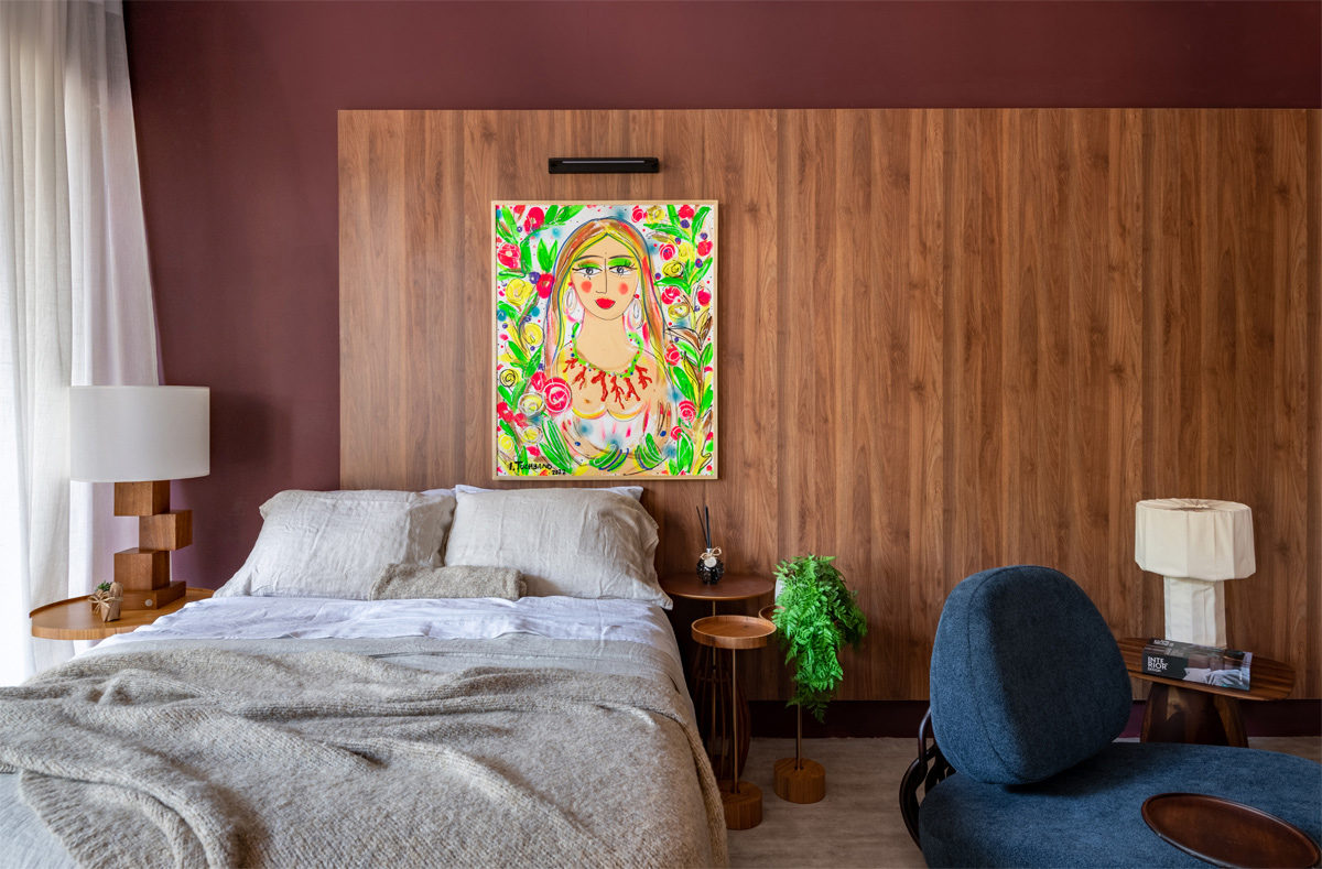 No quarto, Susana usou MDF Linha BP Raízes, também no padrão Noce Oro, nas paredes, enquanto no painel da televisão ela optou pelo Ripado Eucatex no padrão Fumê.
