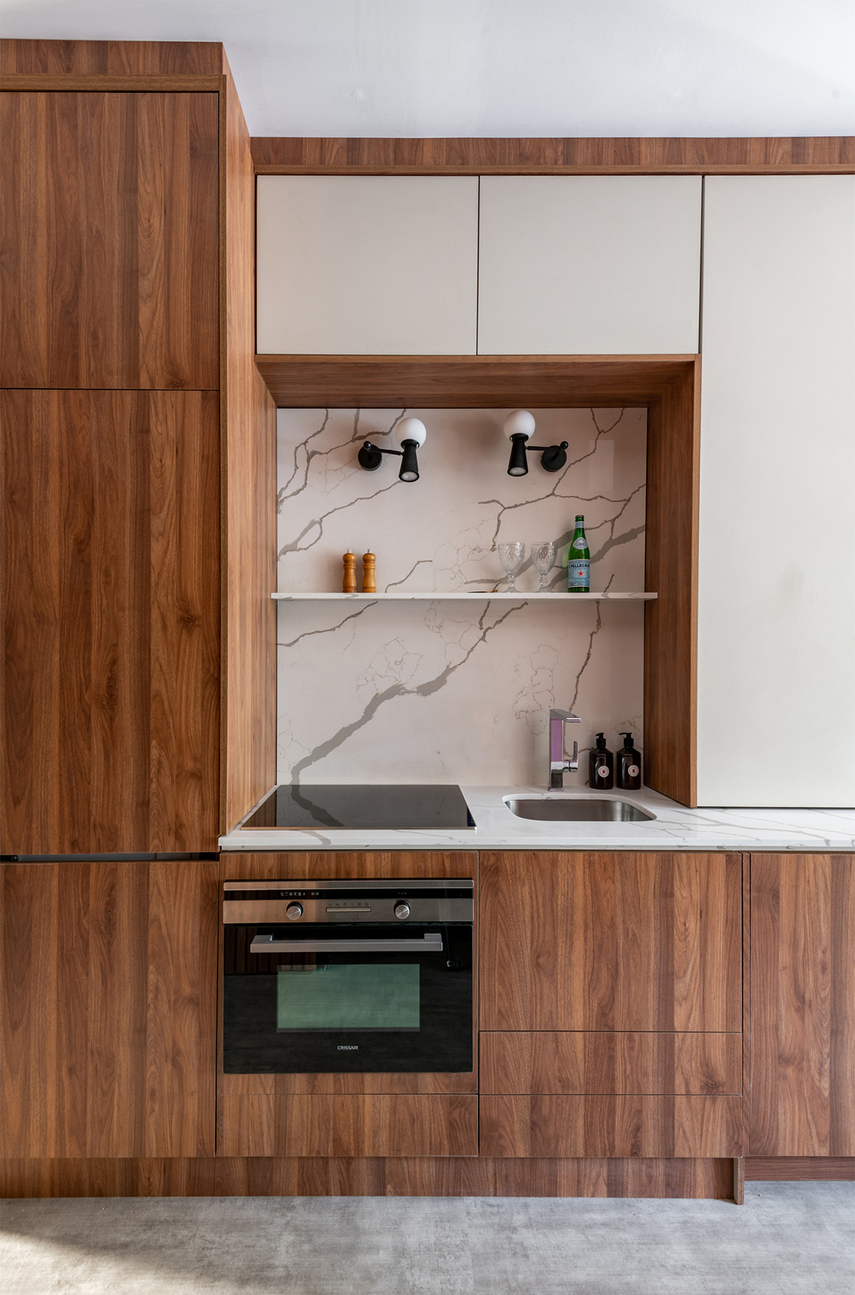 Na cozinha, Susana optou pela combinação entre os padrões Noce Oro, da Linha BP Raízes, e Arenas, da Linha Grafis. Foi também usada uma máquina lava-louças e uma geladeira embutidas nos armários, o que economizou espaço e deixou o ambiente harmonioso e prático.