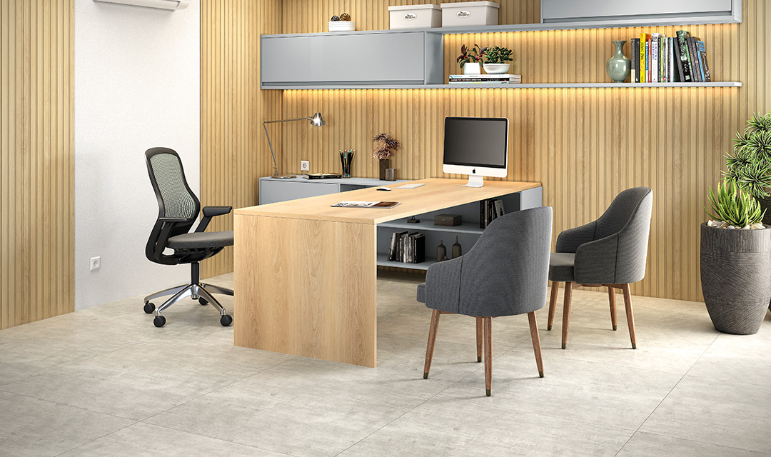 Na foto de capa acima, temos o padrão Concreto aplicado em um escritório. Esse tom de cinza, que remete ao cimento, confere um toque industrial à decoração, valorizando a sofisticação e a neutralidade dos ambientes com seriedade.
