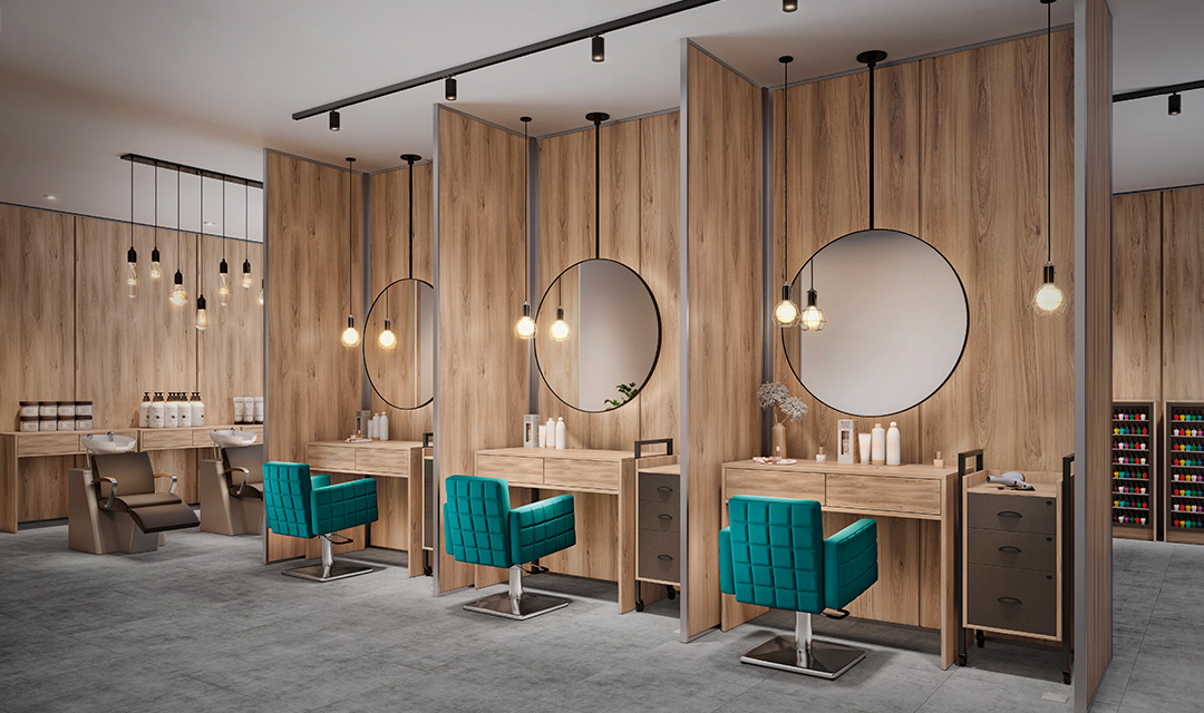 Nesse salão de cabeleireiro, as divisórias Novitá no padrão Elmo Macciato foram aplicadas na divisão com o corredor do ambiente e como detalhe na penteadeira. Aconchego e harmonia que encantam!