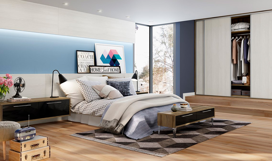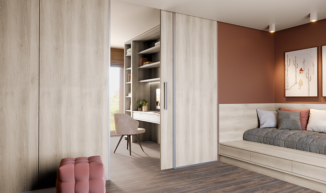 Aqui temos, na prática, um exemplo da versatilidade das Divisórias Eucatex! O padrão Legno Crema, um amadeirado suave e discreto, foi aplicado em um dormitório com o objetivo de dividir o espaço entre a cama e a escrivaninha, tornando o cômodo mais prático e funcional.