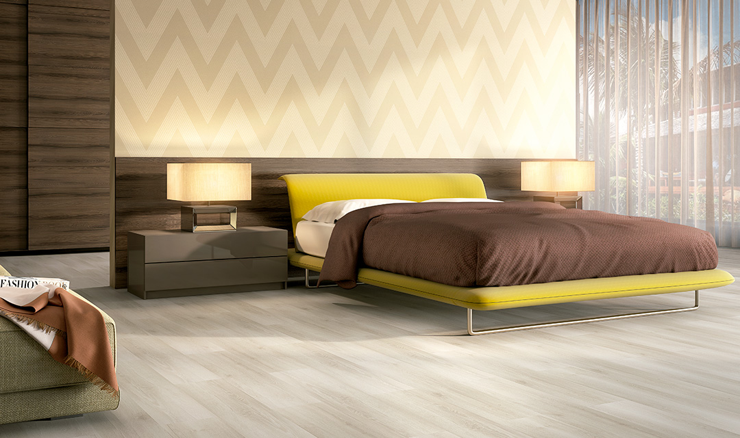 Nesta imagem, o Legno Crema, da Linha New Evidence de pisos laminados, está em destaque em um dormitório que exala calmaria e bem-estar. Esse padrão é uma excelente escolha para quem busca um amadeirado que contribua para uma estética relaxante e confortável, mas sem o peso de uma tonalidade escura.