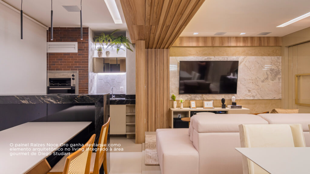No projeto do arquiteto Diego Studart, a madeira exerce a função de delimitar espaços dentro de uma área integrada entre a varanda gourmet e o living. O profissional elegeu o MDF Raízes Noce Oro para compor uma parte do painel de parede do estar e como revestimento de uma viga que separa estes dois espaços, trazendo mais atenção para este elemento arquitetônico e transformando-o em um ponto de destaque.
