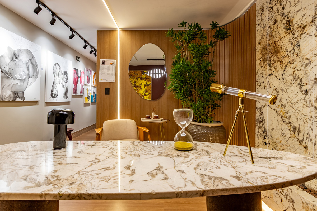 Para um toque mais aconchegante, tivemos o ripado em barras no padrão Freijó Brasil no Estar Executivo de Débora Amorim e Gabriela Paranhos para a Morar Mais BH 2025, que criaram um espaço muito sofisticado e elegante, com elementos de pedras e tons terrosos que evidenciam esta elegância.