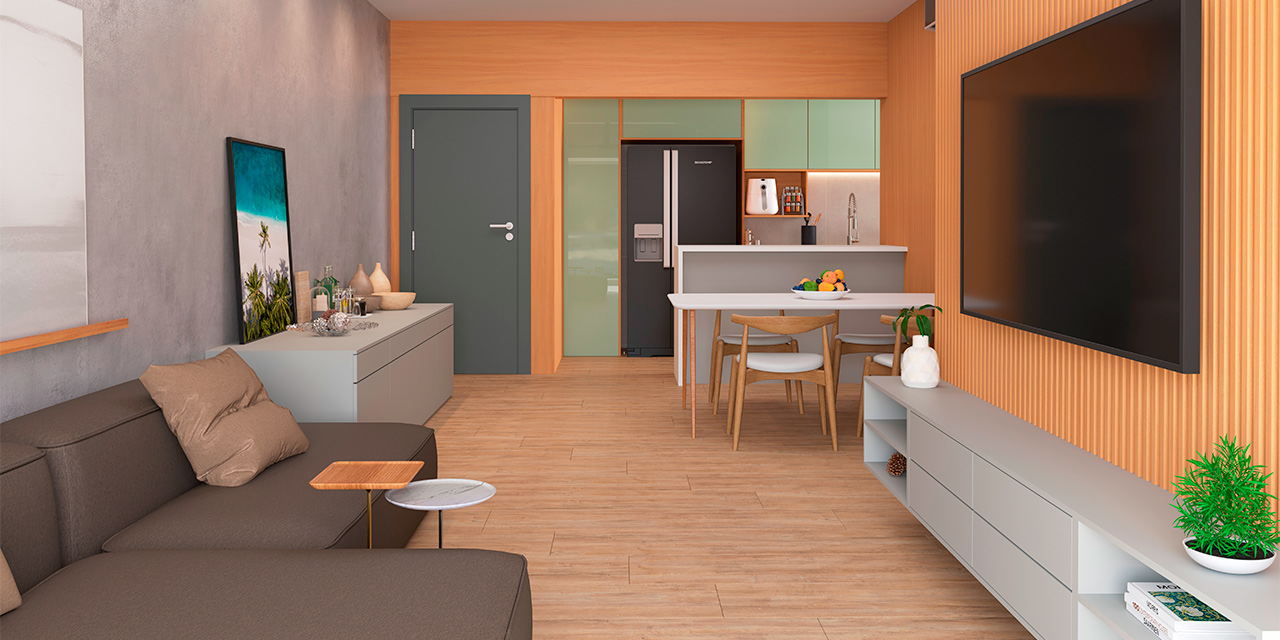 A cor de madeira escura com discretas variações aquece os espaços, destacando-se em projetos com paredes mais claras.